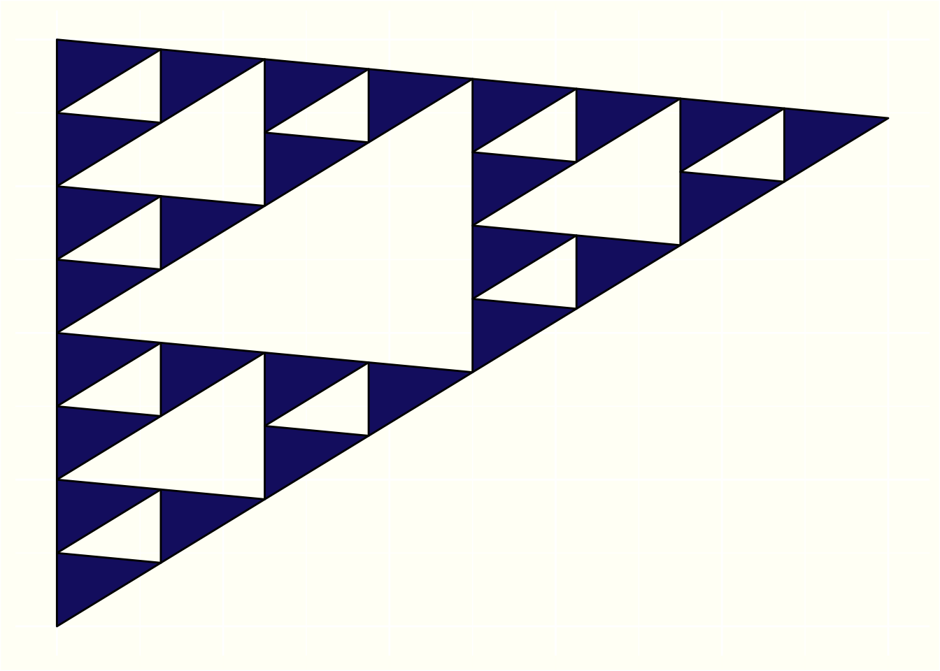 The SierpiĆski triangle is a fractal that is formed through an iterative process known as the chaos game. Starting with a single equilateral triangle, each subsequent iteration involves selecting a random vertex of the triangle and placing a new triangle with sides that are half the length of the original triangle. The new triangle is positioned such that its base coincides with the side opposite the selected vertex of the previous triangle.